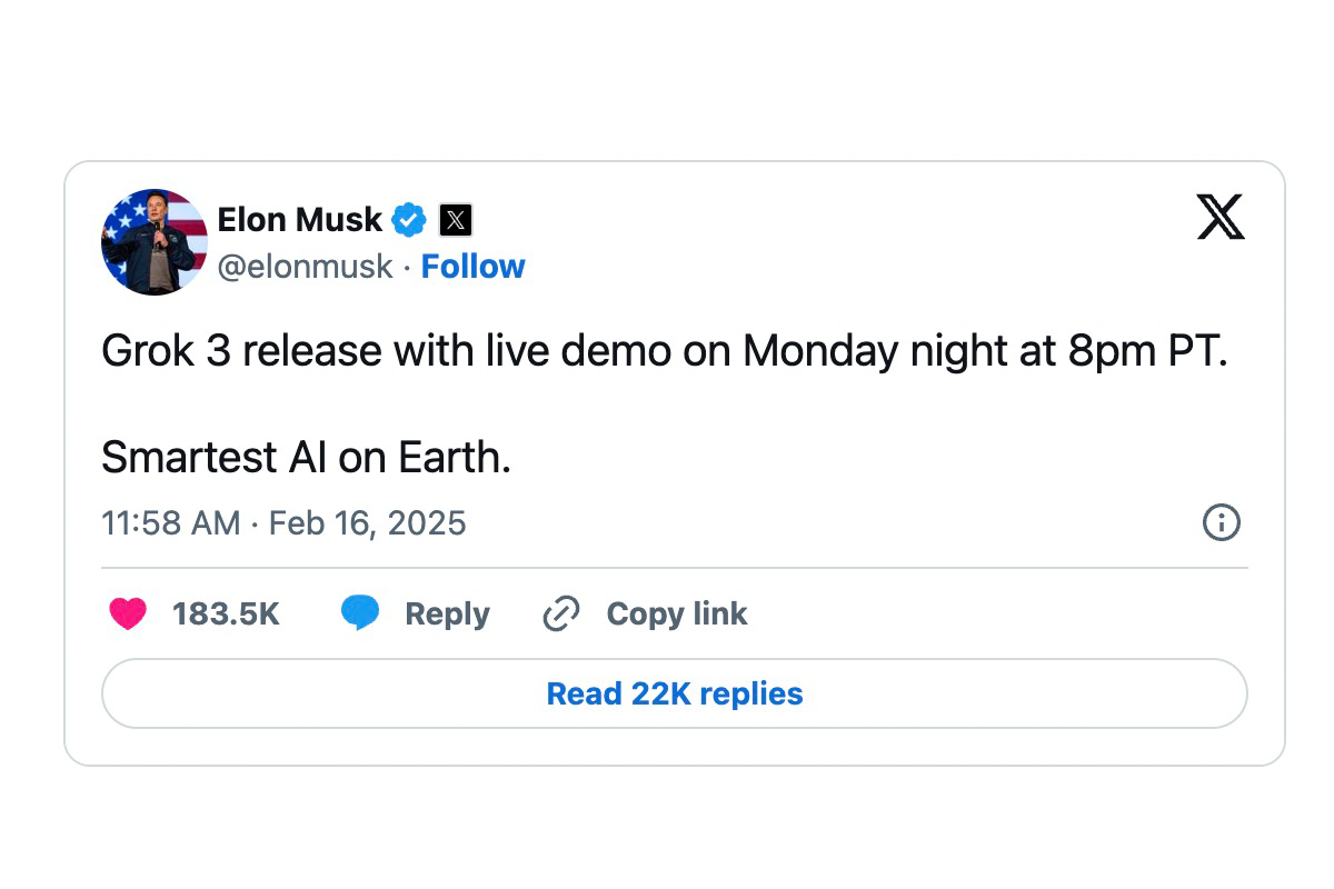 イーロン・マスク氏は、最新の生成AI「Grok 3」を2月18日午後1時(日本時間)にリリースすることを自身のXアカウントで発表しました。