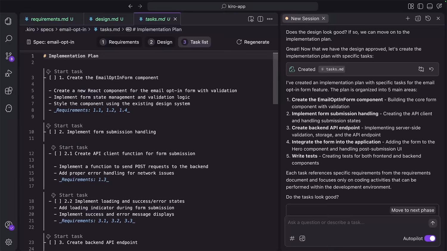 Kiroスペックでは、提示された要件からユーザーストーリーを自動生成し、技術設計にもつながります。
