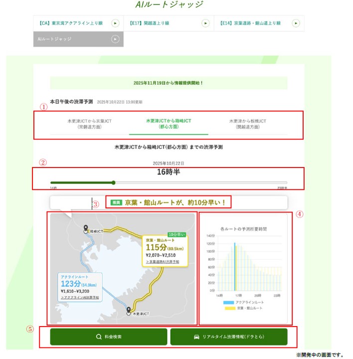 このサービスでは、特定エリアまでの所要時間をAIが予測し、東京湾アクアライン経由と館山自動車道・京葉道路経由のどちらが早いかを表示します。