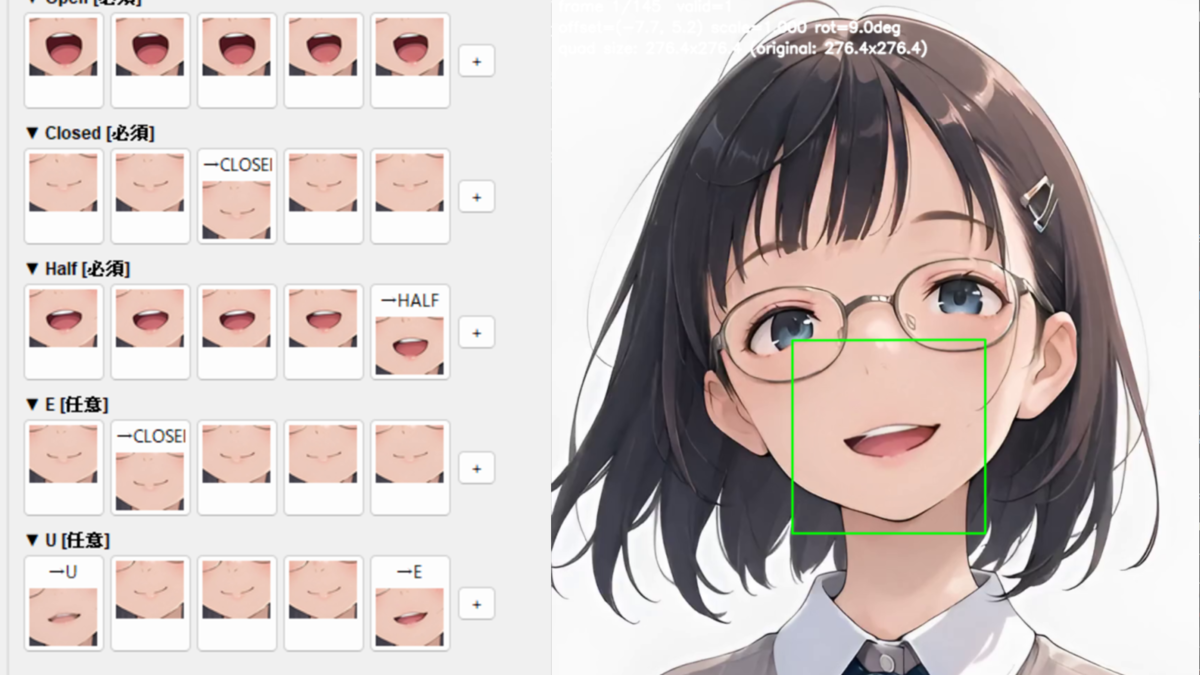 筆者も「PNG TUBE Studio」というアプリを作成し、4枚の差分画像を使って音声に合わせた口パクや目パチを行うことができるようになりました。