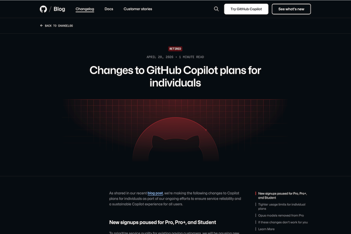 GitHubは4月20日に、AIツール「GitHub Copilot」の一部有料プランについて新規登録を一時停止することを発表しました。