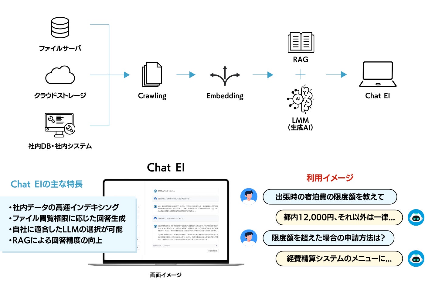 また、「Chat EI」は企業内検索エンジン「Neuron Enterprise Search」の技術応用も行っており、利用者のファイル閲覧権限に応じた回答を提供する。