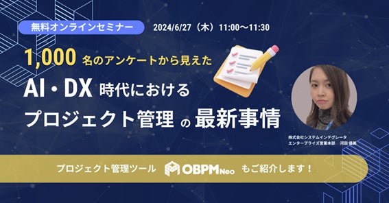 株式会社システムインテグレータは、1,000名のアンケート結果をもとに、AI・DX時代におけるプロジェクト管理事情について解説するセミナーを開催します。