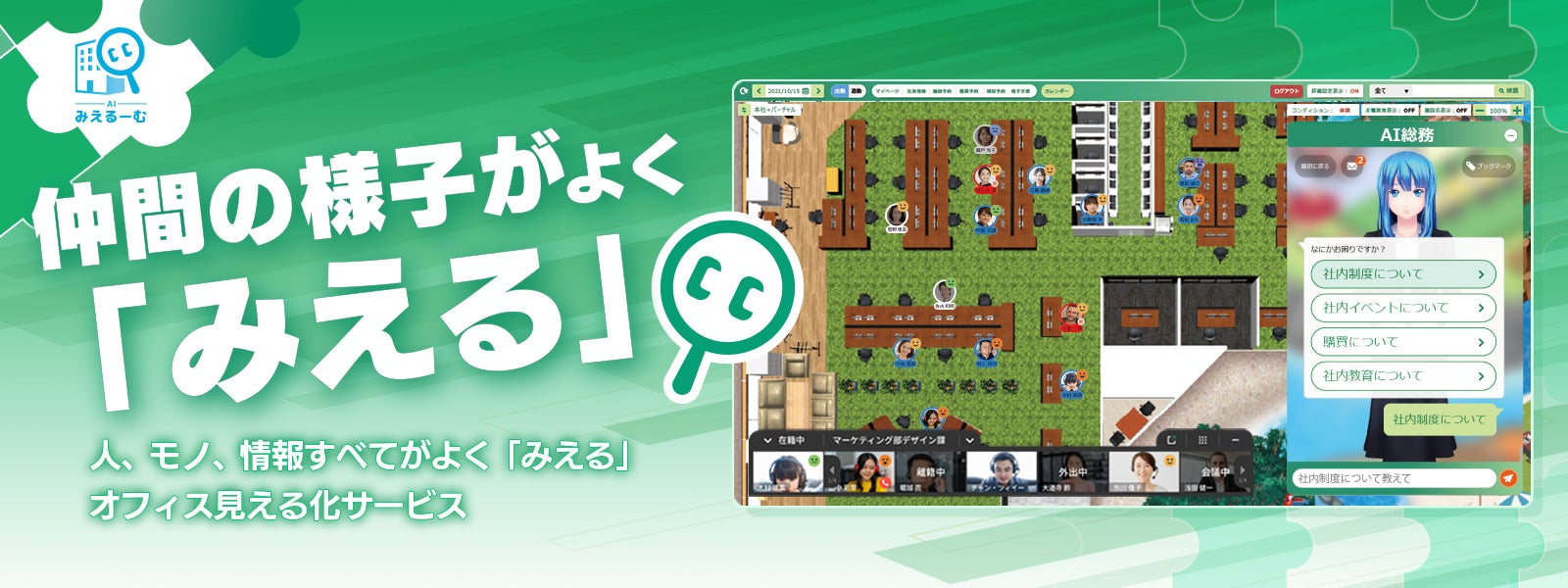AI みえるーむは、高性能スケジュール機能やAI総務機能を追加したハイブリッドワークに適した製品であり、仲間の状況やオフィスの様子、業務の可視化が可能となっている。