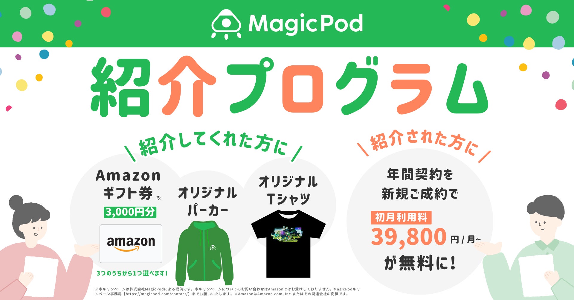 ギフト券やオリジナルグッズがもらえる特典があり、過去に「MagicPod」を6ヶ月以上利用したユーザーが紹介すると、紹介された方が年間契約すると初月の利用料が無料になります。