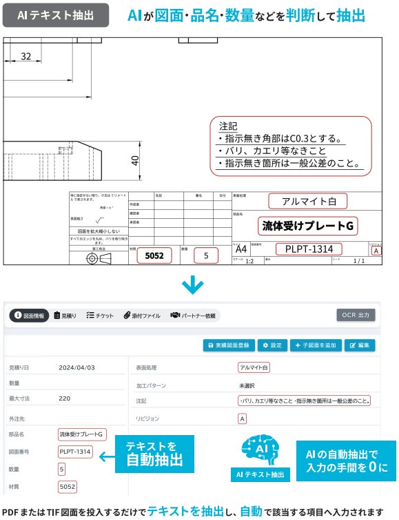 図面をアップロードするだけで、品名や数量、材質などの情報を自動で抽出し、製造業のDX化を実現する。