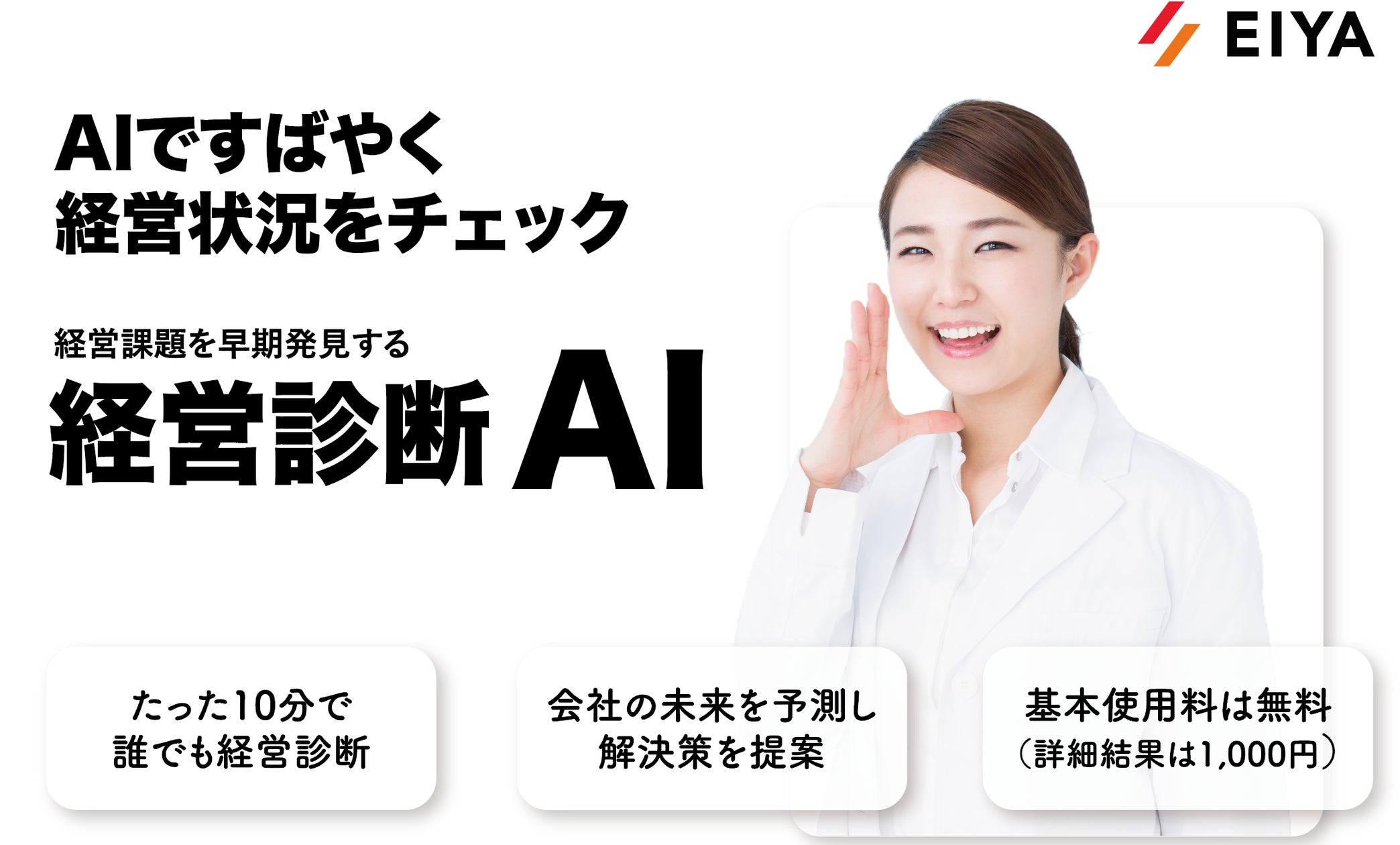 このAIサービスは、企業の健康診断として開発され、ユーザーが簡単な設問に答えるだけで経営状況とその兆候を可視化し、未来予測も可能です。