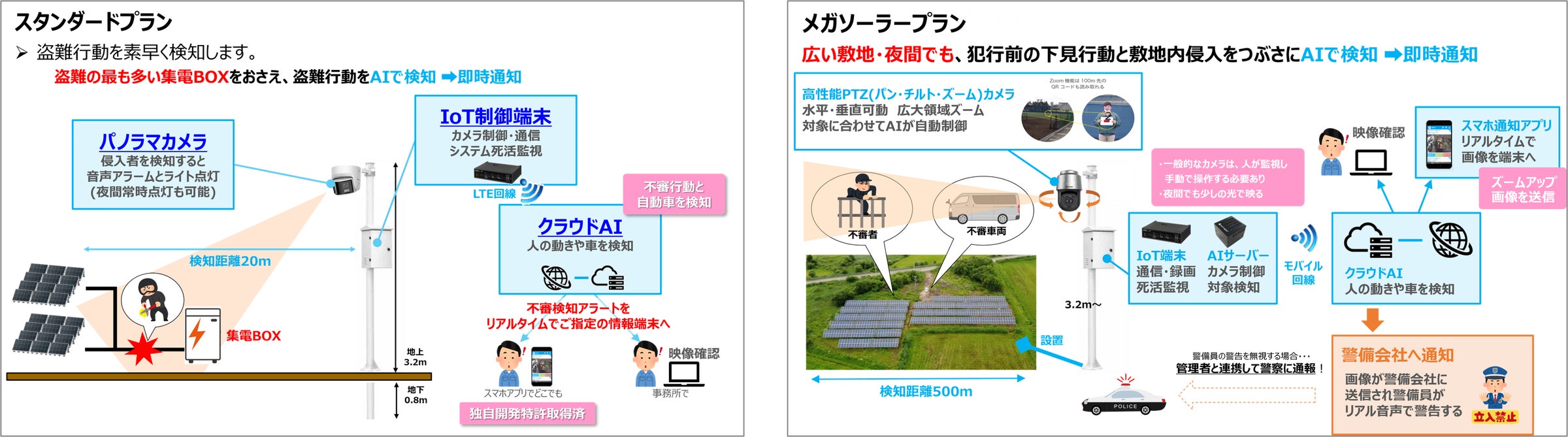 選べるプランは「スタンダードプラン」と「メガソーラープラン」で、スタンダードプランは主に集電BOX周辺の防犯に特化し、メガソーラープランでは500mの範囲をカバーし、警備会社との連携も可能です。