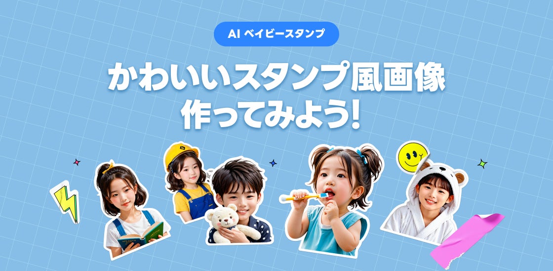 このサービスでは、ユーザーが提供した顔写真をもとに、子ども姿のスタンプ風画像をAIが生成します。