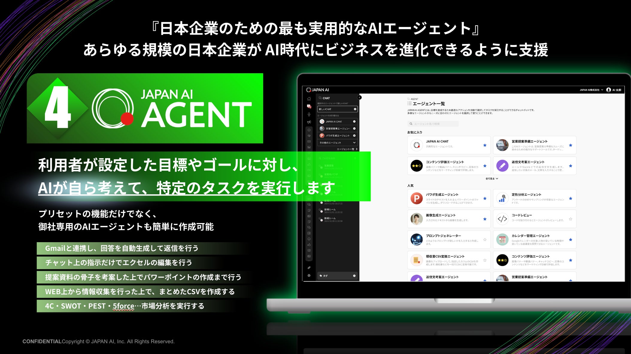 このAIエージェントは、日本企業向けに特化されており、実用性を重視しています。