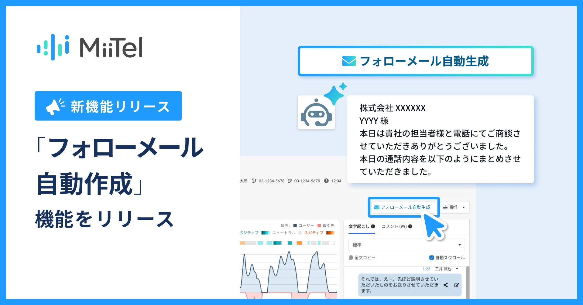 電話解析AI「MiiTel Phone」が新たに「フォローメール自動作成」機能をリリースしました。