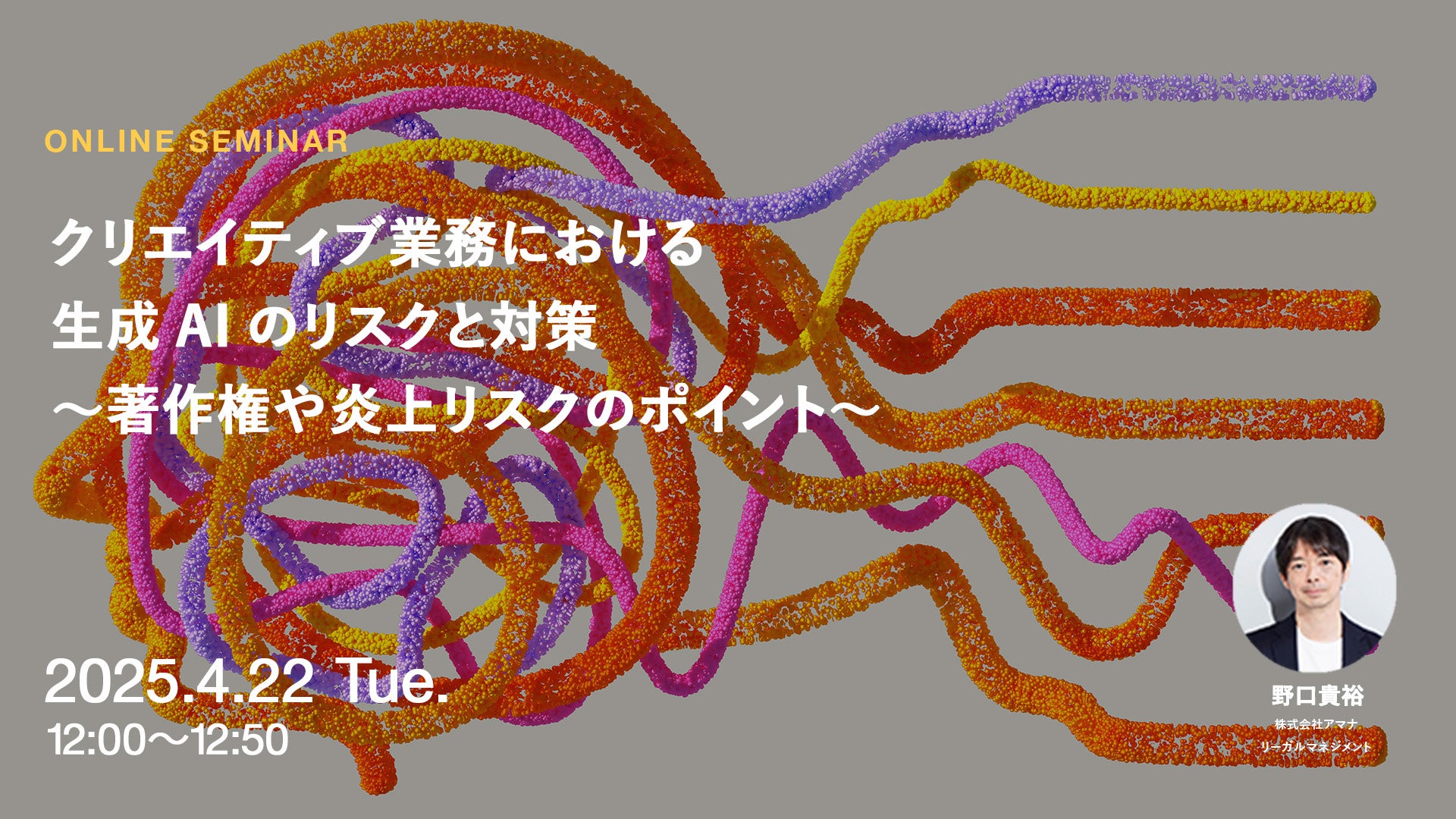「2025年4月22日(火)クリエイティブ業務における生成AIのリスクと対策」では、生成AIがもたらす著作権や炎上リスクについて詳しく考察されます。
