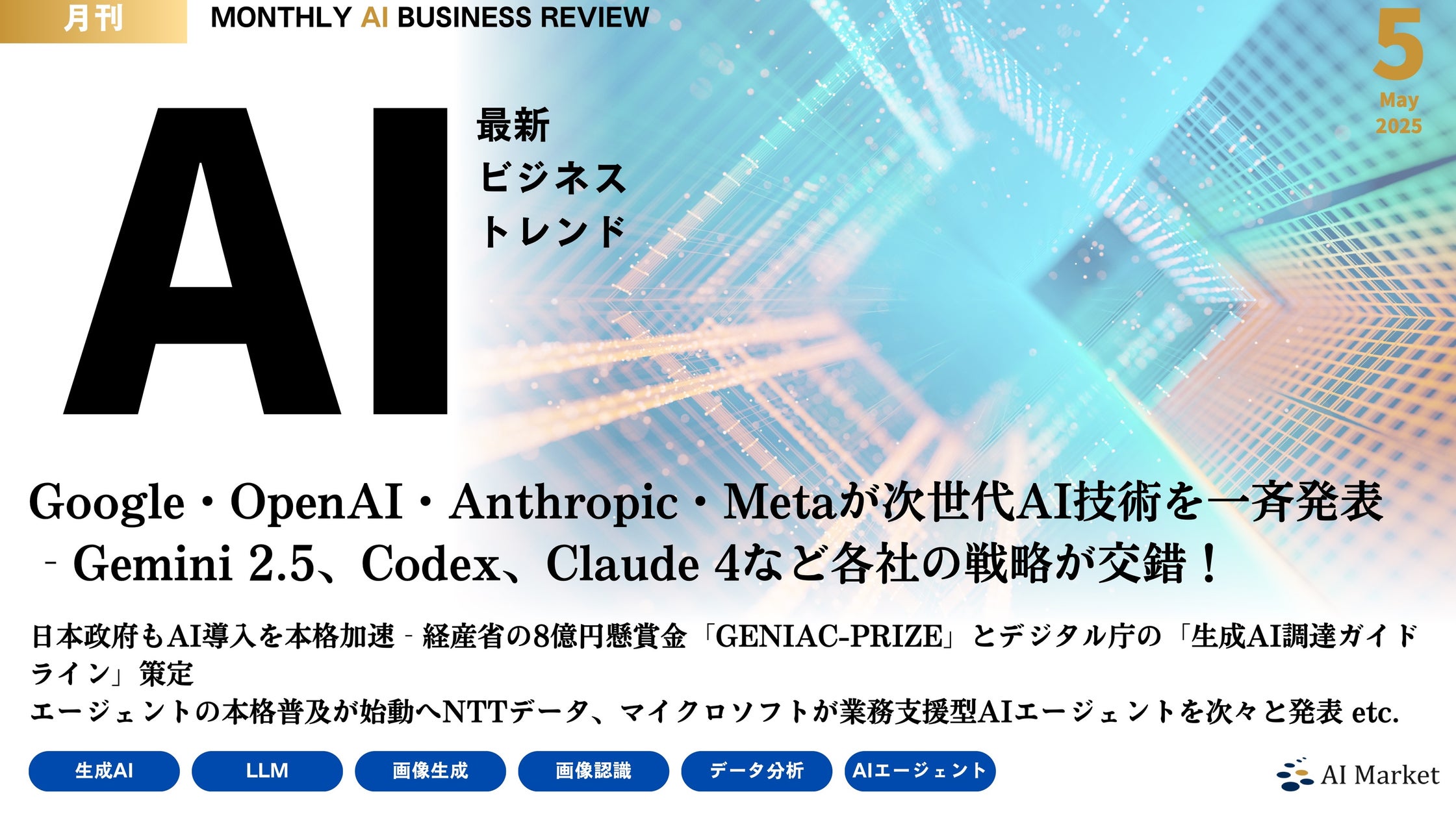 「MONTHLY AI BUSINESS REVIEW 2025年5月号」では、Google I/O 2025やMicrosoft Build 2025などの最新のAIビジネストレンドを紹介しています。