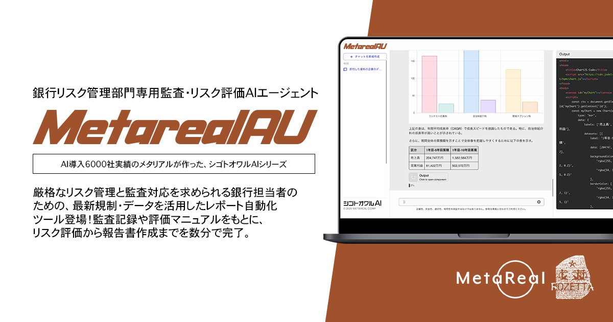 メタリアル・グループは、内部リスク評価を支援するAIエージェント「Metareal オーディット(Metareal AU)」を2023年6月5日に提供開始しました。