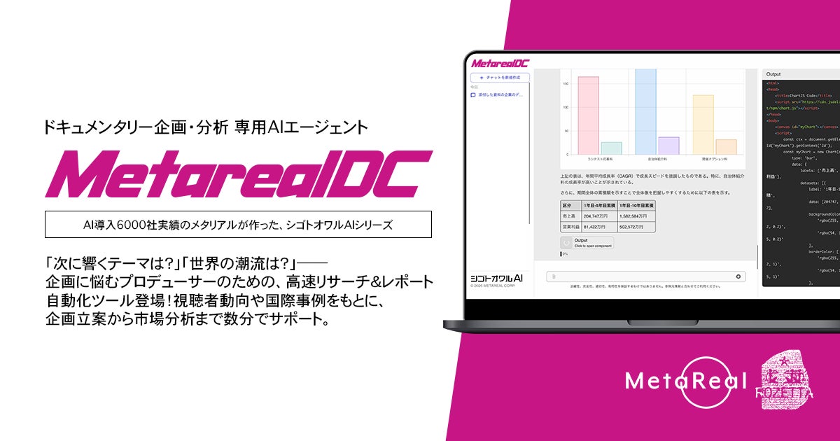 メタリアル・グループは、ドキュメンタリー企画や市場分析レポートの作成を支援するAIエージェント「Metareal ドキュメンタリー(Metareal DC)」を2023年6月19日に提供開始しました。