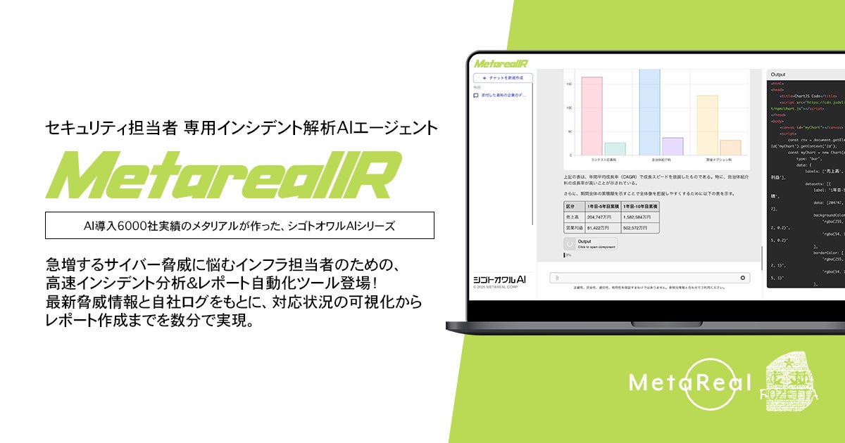 メタリアル・グループは、セキュリティインシデント解析レポートを自動で作成するAIエージェント「Metareal インシデントレスポンス(Metareal IR)」を2023年6月23日に提供開始しました。