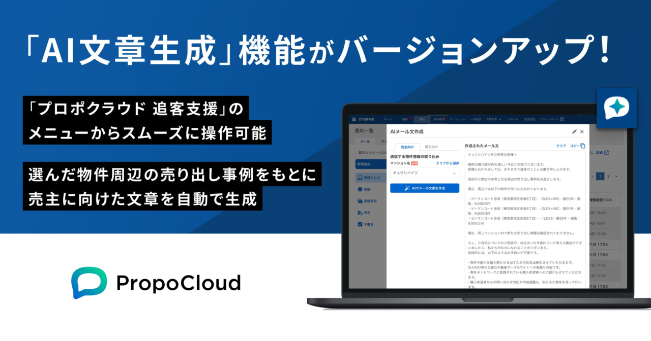 「プロポクラウド 追客支援」が新たに売主提案向けの「AI文章生成」機能を提供開始しました。