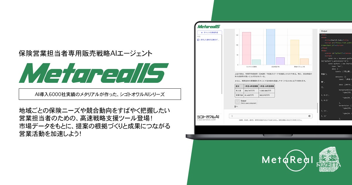 メタリアル・グループは、保険販売戦略と市場分析を行うAIエージェント「Metareal インシュランスセールス(Metareal IS)」を6月27日に提供開始しました。