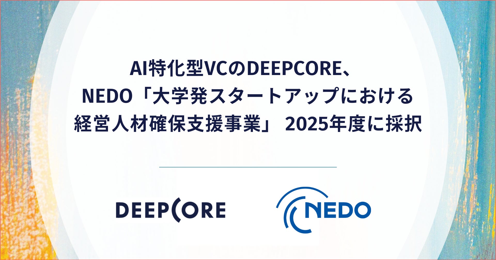 AI特化型ベンチャーキャピタル(VC)のDEEPCOREが、2025年度にNEDO(新エネルギー・産業技術総合開発機構)の「大学発スタートアップにおける経営人材確保支援事業」に採択されました。