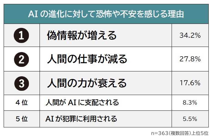 このアンケートでは、AIが仕事を奪うことへの不安や、プライバシー侵害の懸念が特に多く挙げられています。