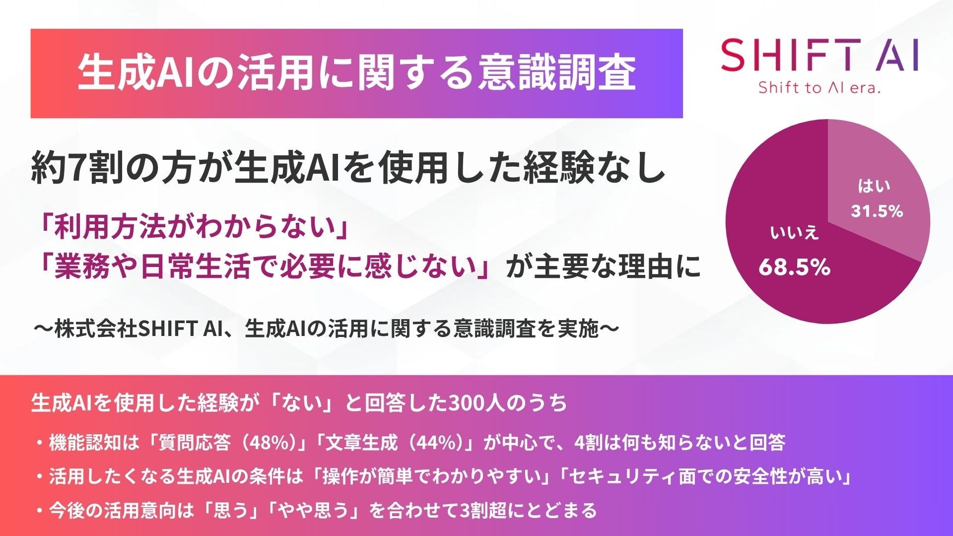 株式会社SHIFT AIのプレスリリース(2025年7月30日 11時00分)約7割の方が生成AIを使用した経験なし「利…