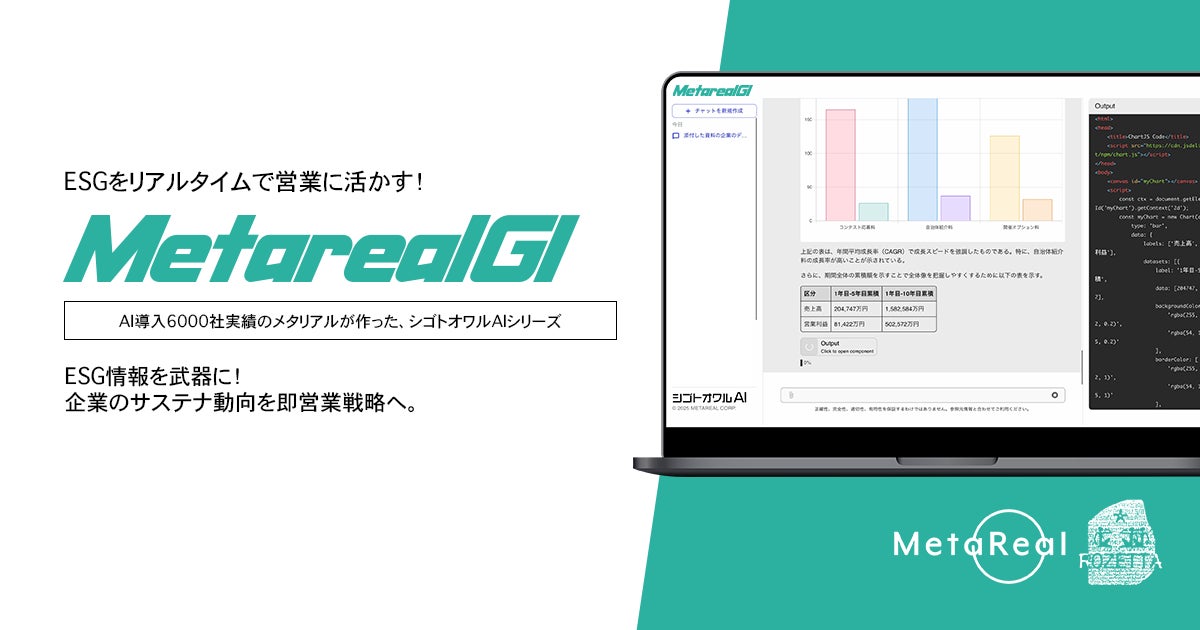 メタリアル・グループは、法人顧客向けのESG(環境・社会・ガバナンス)活動を分析するAIエージェント「Metareal ESGインサイト(Metareal GI)」を9月1日に提供開始しました。