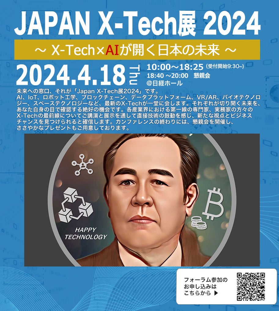 展示では、AI、データテック、知財テック、観光テック、フードテックなど、さまざまなX-Techが一堂に会し、日本の未来を切り拓く様々な展示物や講演が行われます。
