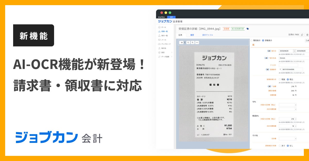「ジョブカン証憑管理」が新たに「AI-OCR機能」を導入しました。