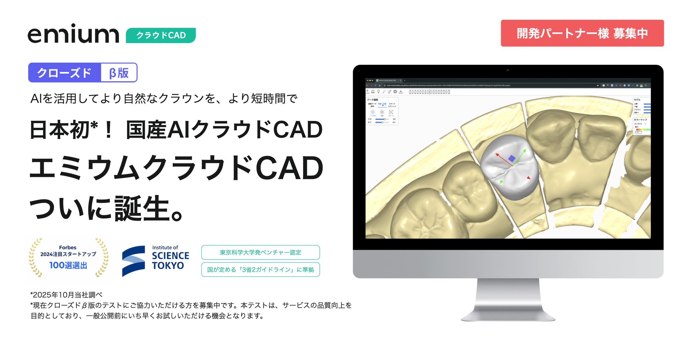 東京科学大学発のベンチャー企業エミウムは、歯科業務のデジタルトランスフォーメーション(DX)を支援するために、日本初の国産AIクラウドCAD「エミウム クラウドCAD」のクローズドβテスト版を提供開始しました。