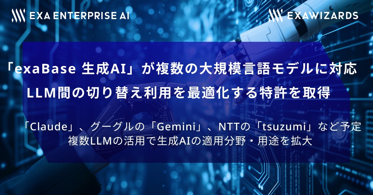 株式会社エクサウィザーズのグループ会社である株式会社Exa Enterprise AIは、法人向けChatGPTサービス「exaBase 生成AI」において、複数の大規模言語モデル(LLM)に対応する特許を取得しました。