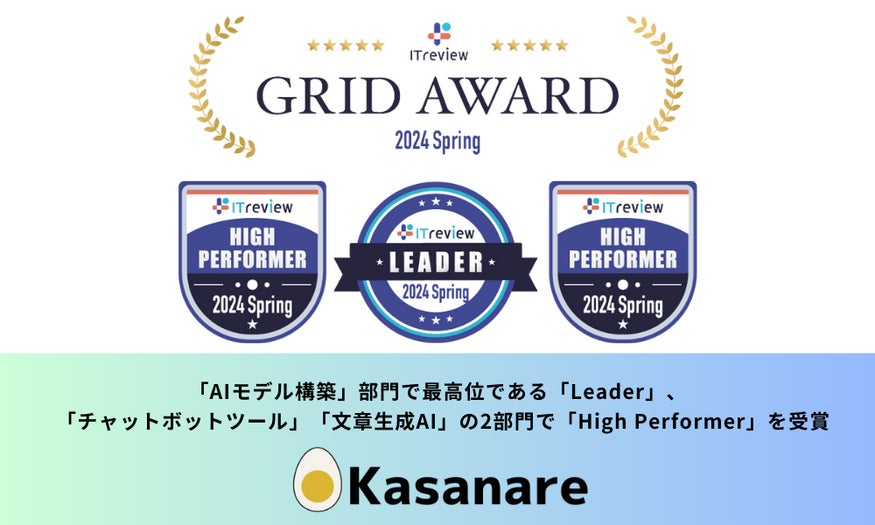 IT製品レビュープラットフォーム「ITreview」の「ITreview Grid Award 2024 Spring」において、カサナレ株式会社がAIモデル構築部門で最高位の「Leader」を受賞し、他の2部門でも「High Performer」を受賞したことが発表されました。