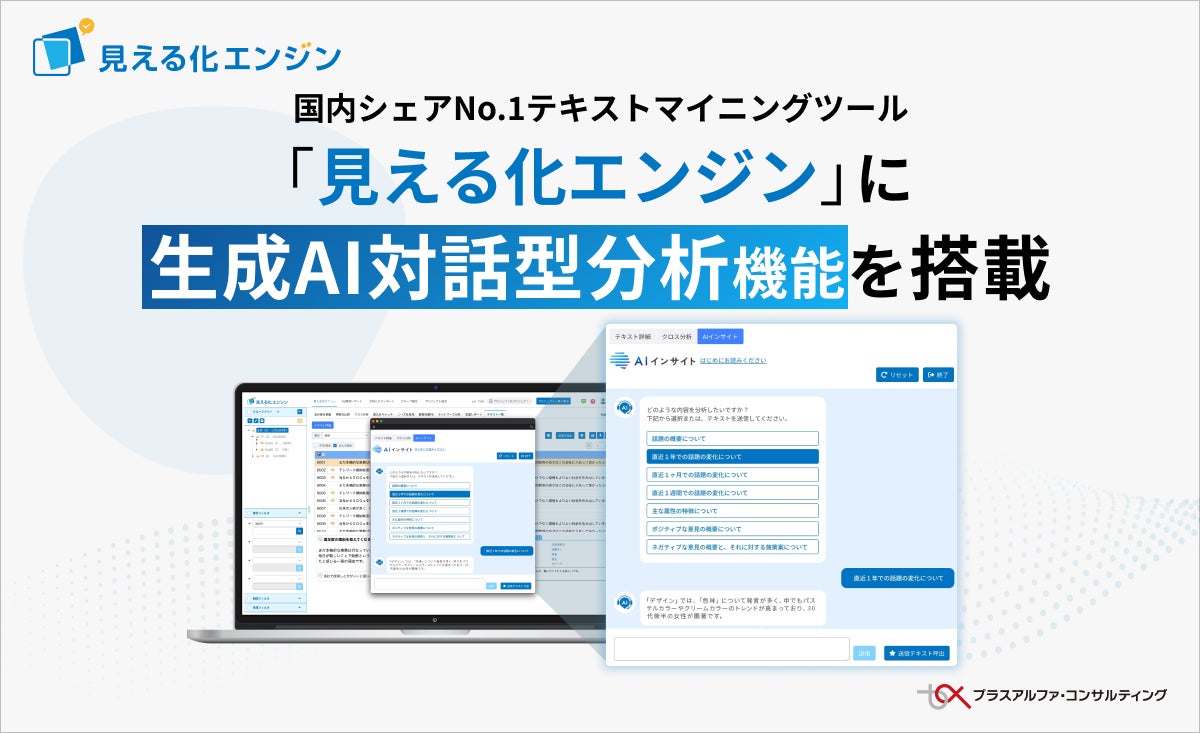 株式会社プラスアルファ・コンサルティングは、シェアNo.1のテキストマイニングツール「見える化エンジン」に、生成AIを活用した対話型分析機能「AIインサイト」を新たに搭載することを発表しました。