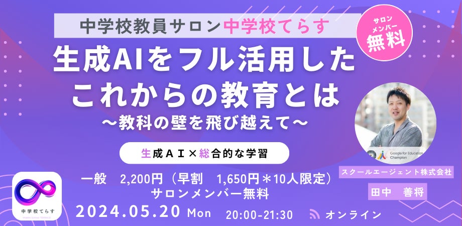 中学校教師向けの会員制サロン「中学校てらす」が主催し、2024年5月20日に開催されます。
