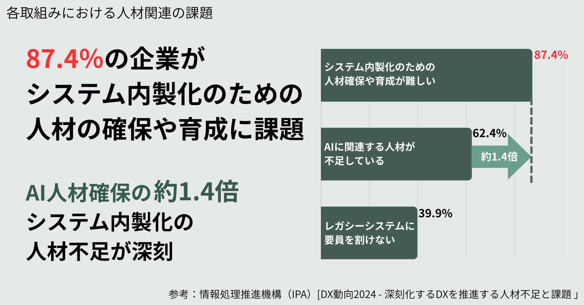 企業がDXを推進するためには、専門的なスキルを持つ人材が不可欠ですが、その育成や確保が難しく、多くの企業が直面している壁となっています。