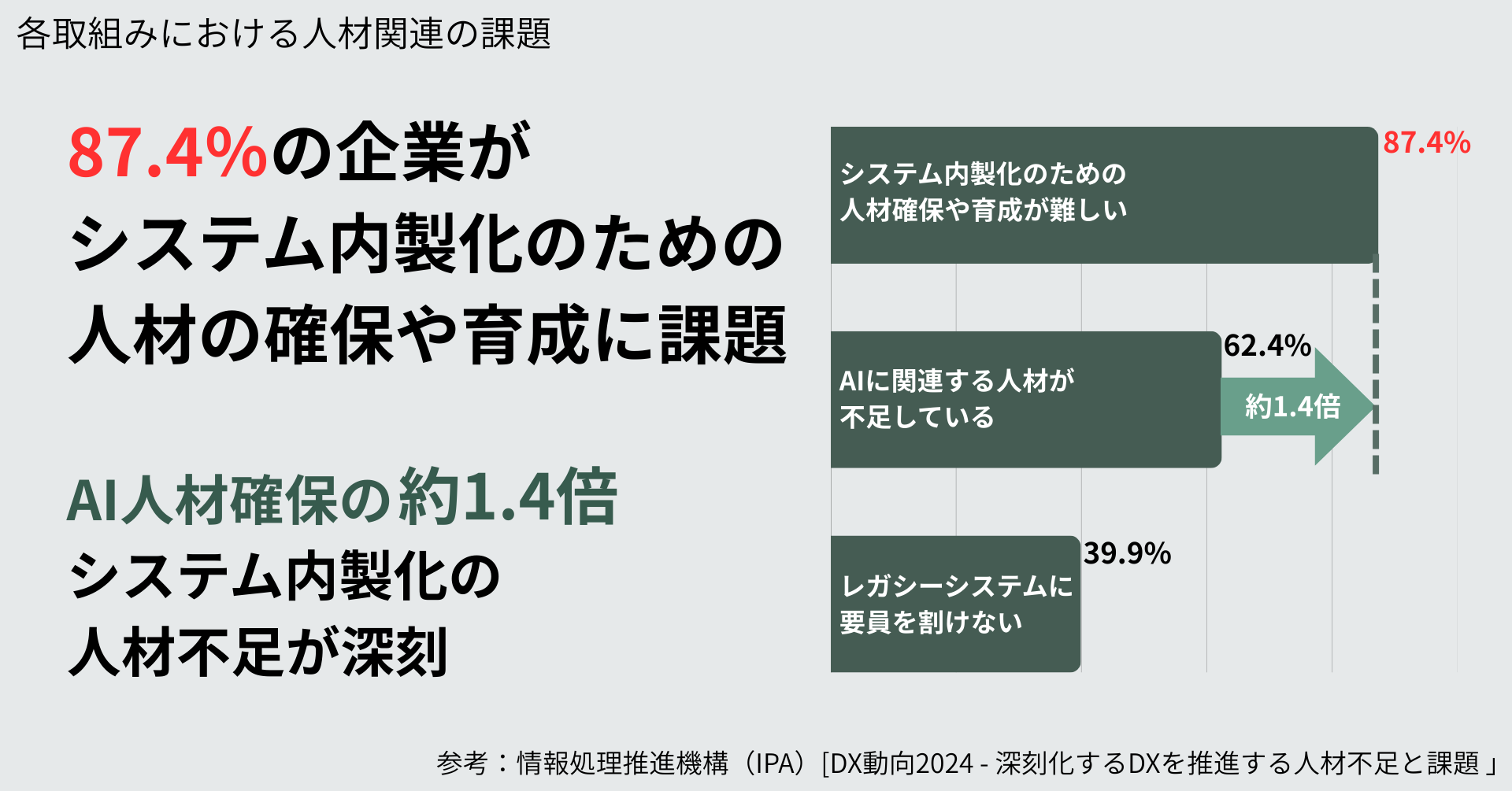 企業がDXを推進するためには、専門的なスキルを持つ人材が不可欠ですが、その育成や確保が難しく、多くの企業が直面している壁となっています。