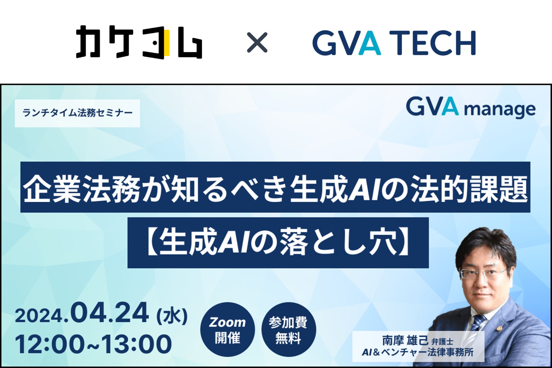 株式会社カケコムは、GVA TECH株式会社と共同で、「企業法務が知るべき生成AIの法的課題」に関するセミナーを開催する。