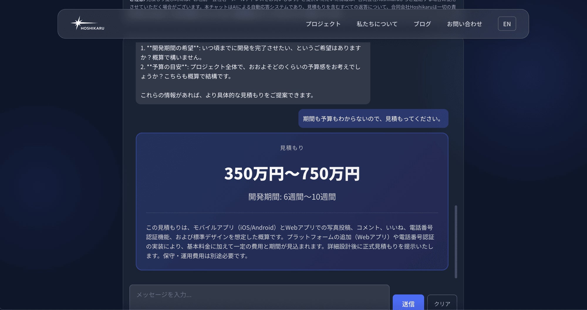 合同会社Hoshikaruが新たに公開した「AI見積もりチャット」は、ユーザーがAIと会話することでアプリ開発の費用と期間を即座に算出できるサービスです。
