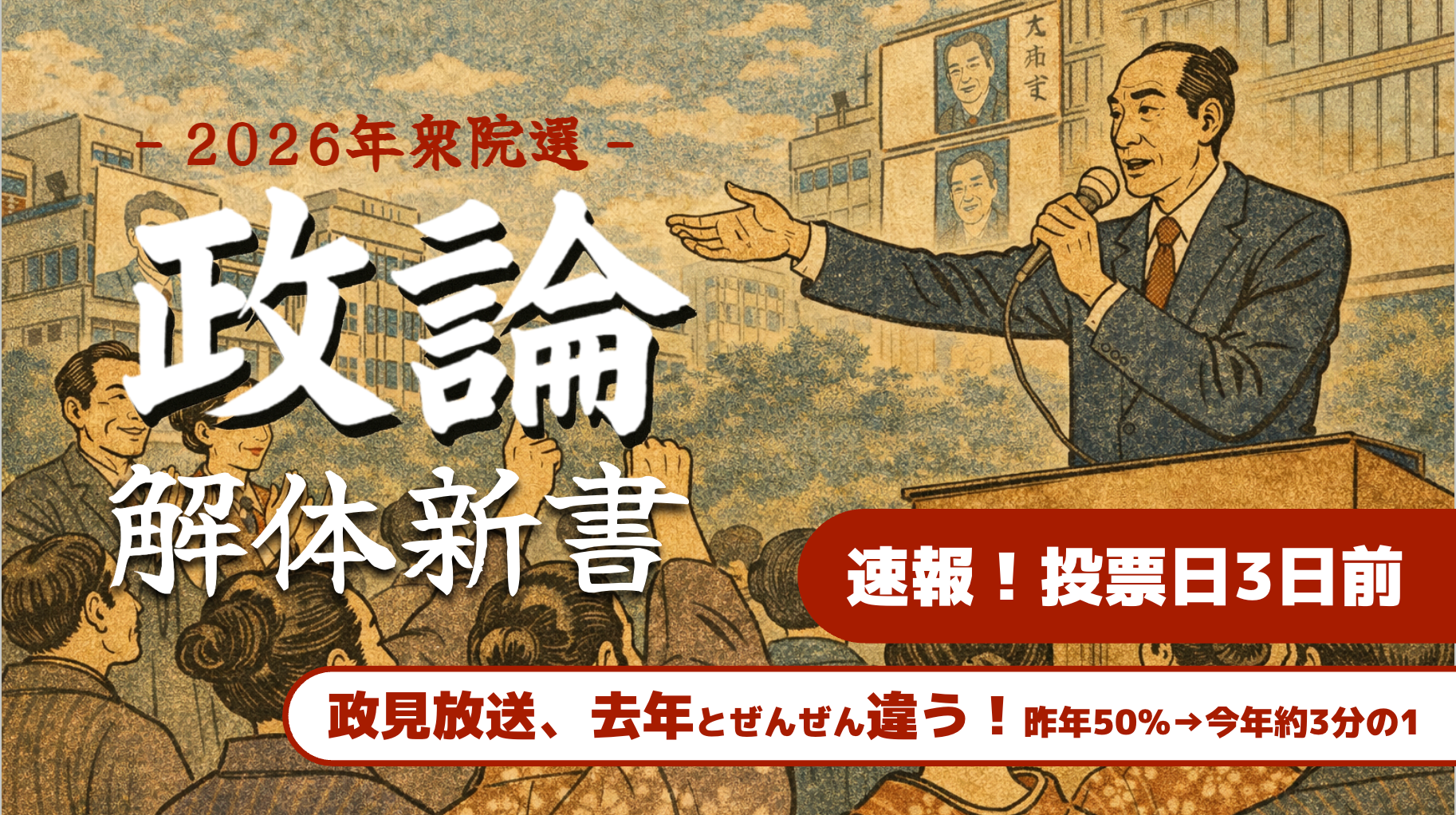 衆院選2026に関する速報として、政見放送での「具体策」の言及が昨年と比べて大幅に減少したことが報告されました。