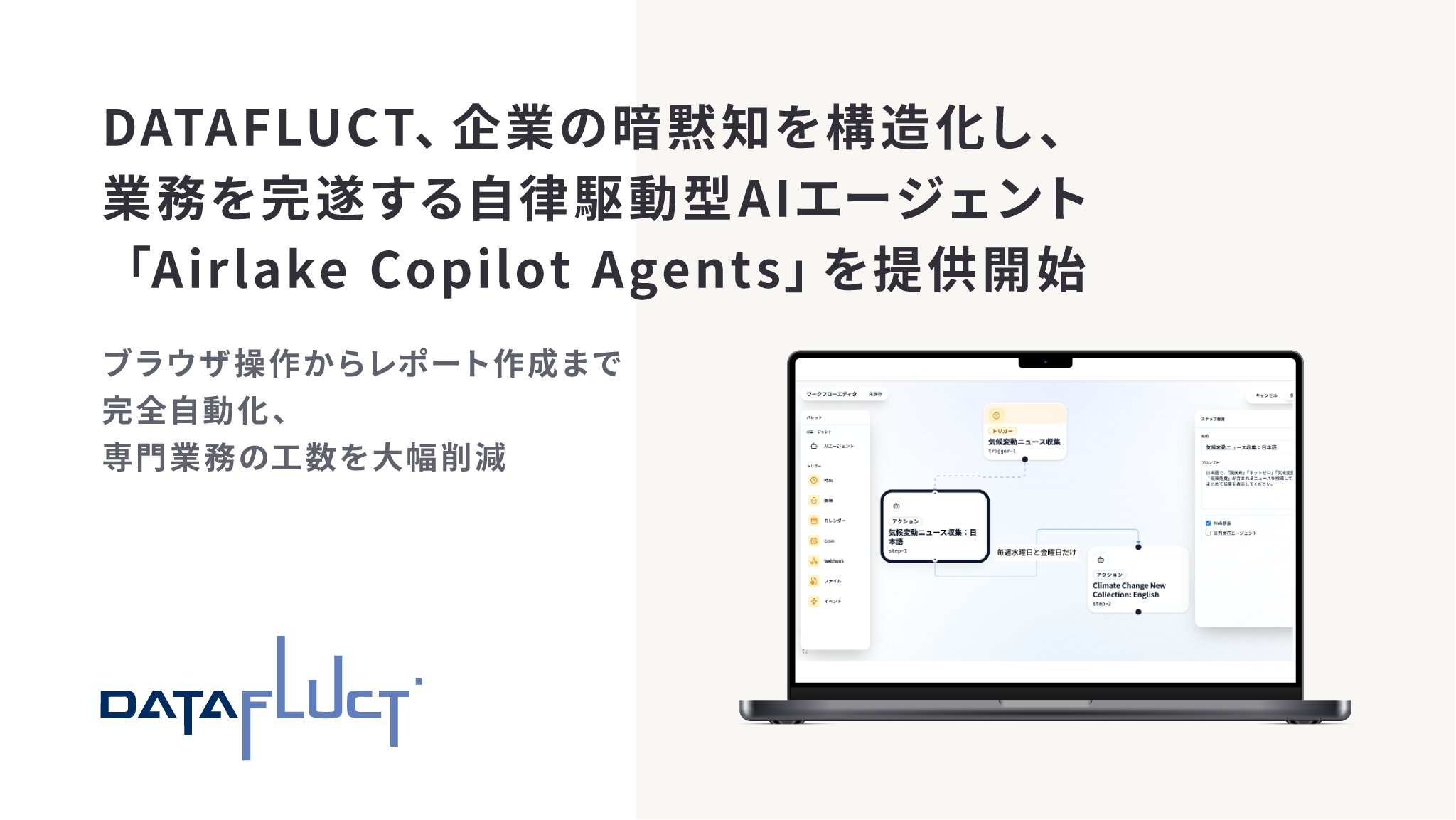 DATAFLUCTは、企業の暗黙知を構造化し、業務の遂行をサポートする自律駆動型AIエージェント「Airlake Copilot Agents」の提供を開始しました。