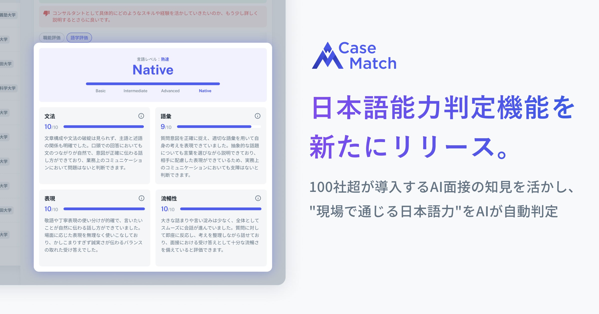 「CaseMatch AI面接」が新たに日本語能力判定機能をリリースしました。