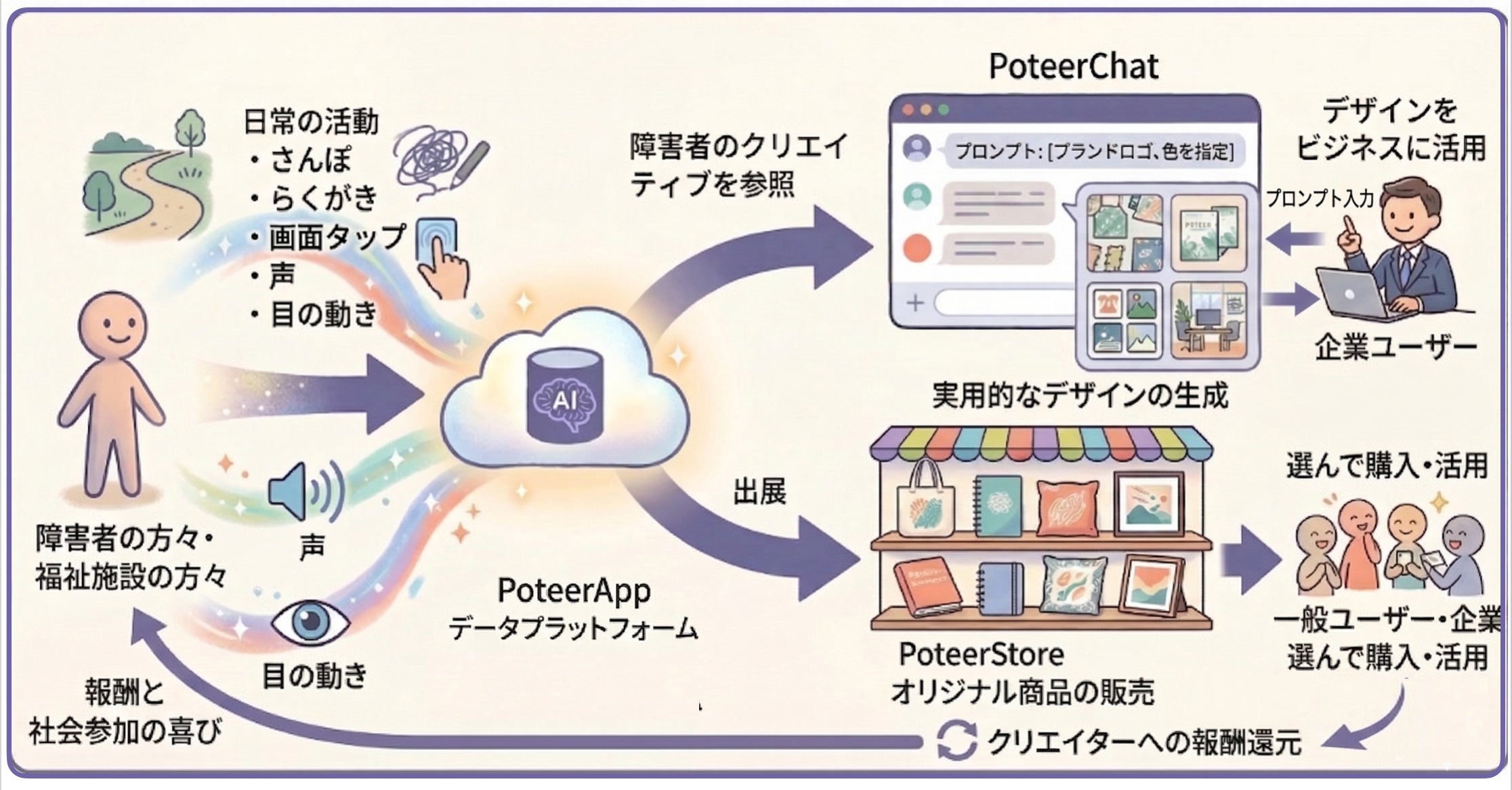 「PoteerChat」は、障害者クリエイターによる創作活動をAI技術を用いて企業デザインに変換する法人向けのSaaSです。