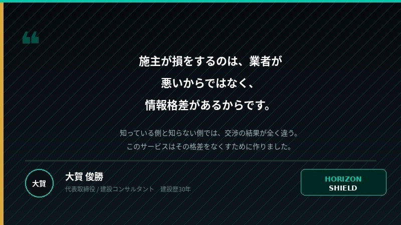 建設業界で30年の経験を持つプロフェッショナルが、施主を守るための新しいサービス「HORIZON SHIELD」を提供開始しました。