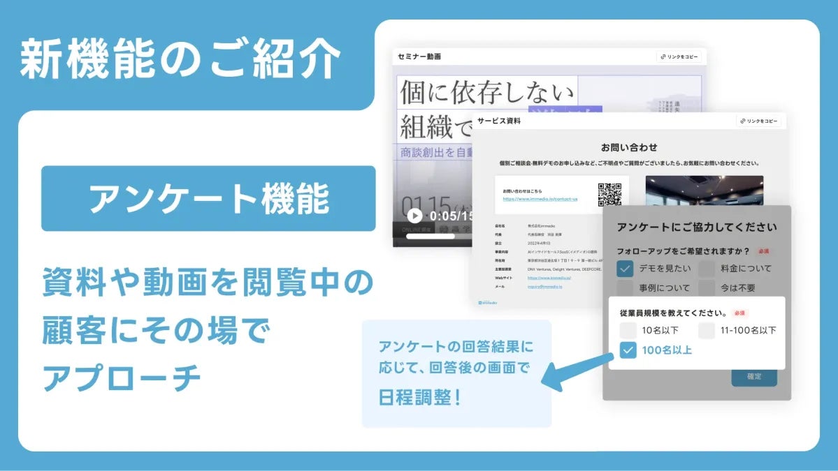 ナーチャリングAI「immedio Box」は、資料や動画の閲覧を商談へとつなげる新しい機能をリリースしました。
