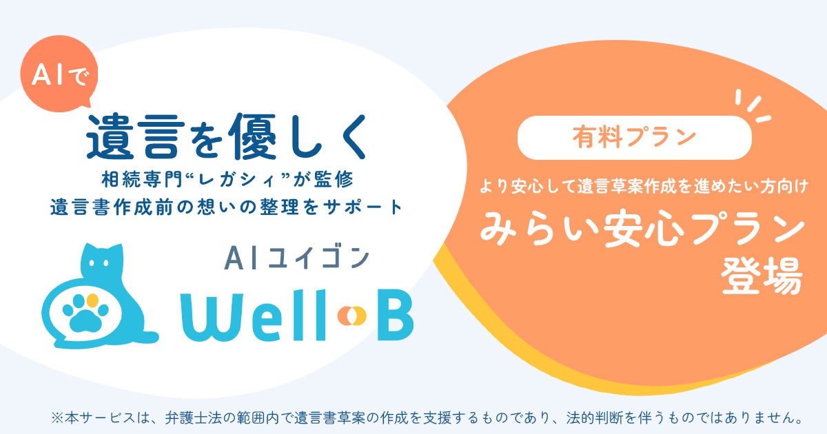 デジタル遺言アプリ「AIユイゴンWell-B」に新たに、長期利用者向けの月額制プラン「みらい安心プラン」が登場しました。