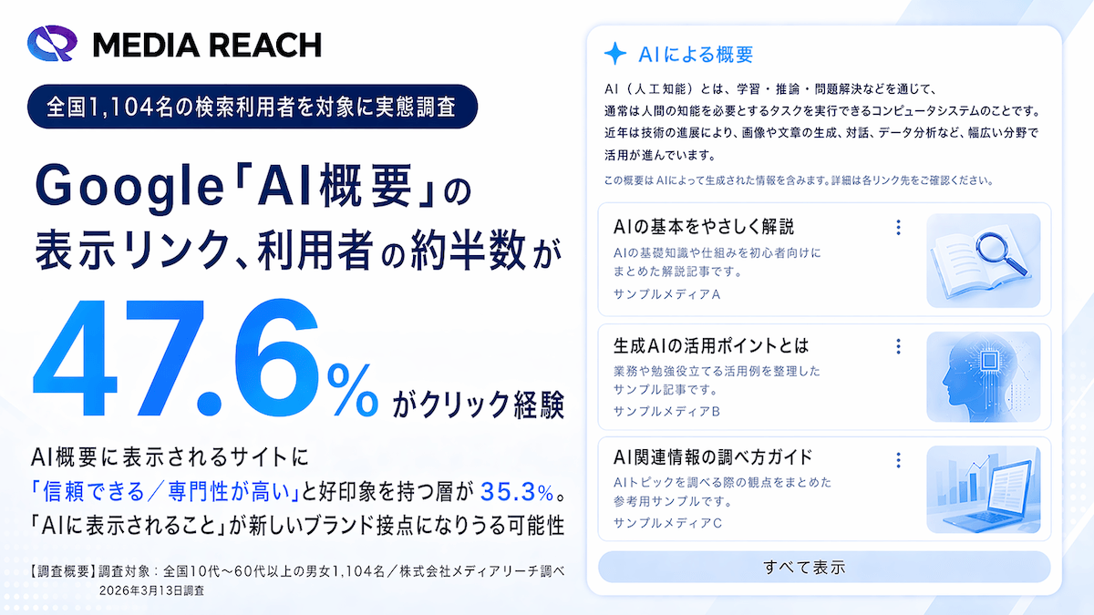 株式会社メディアリーチが実施した調査によると、全国1,104名を対象にした結果、約47.6%の人がGoogleの「AI概要」表示リンクをクリックした経験があることが明らかになりました。