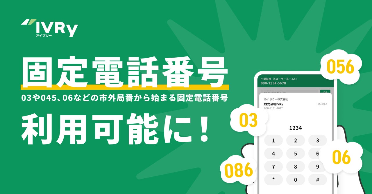 株式会社IVRyは、対話型音声AI SaaSのIVRyにおいて、回線の敷設や機器設置不要で国内全域の固定電話番号(0AB-J番号)の利用が可能になったことを発表しました。