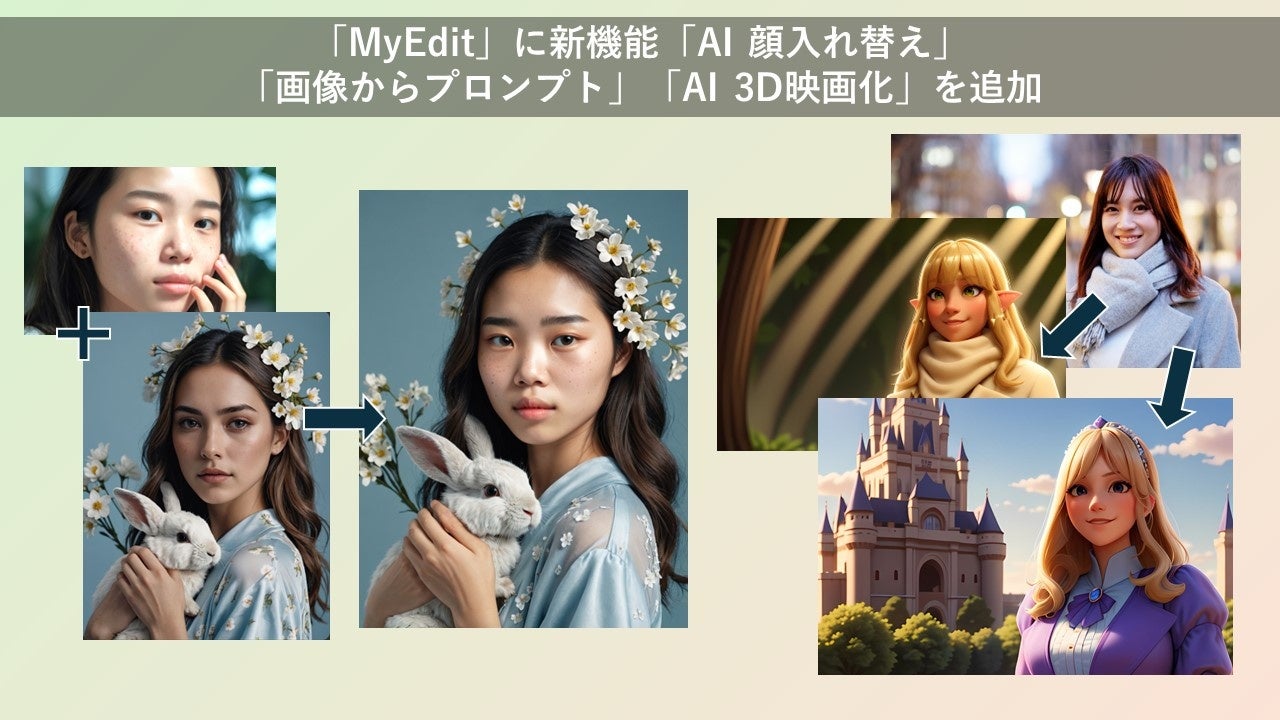 サイバーリンクは、写真編集・音声編集サイト「MyEdit」に「AI 顔入れ替え」機能・AI画像生成「画像からプロンプト」機能・「AI 3D映画化」機能を追加しました。