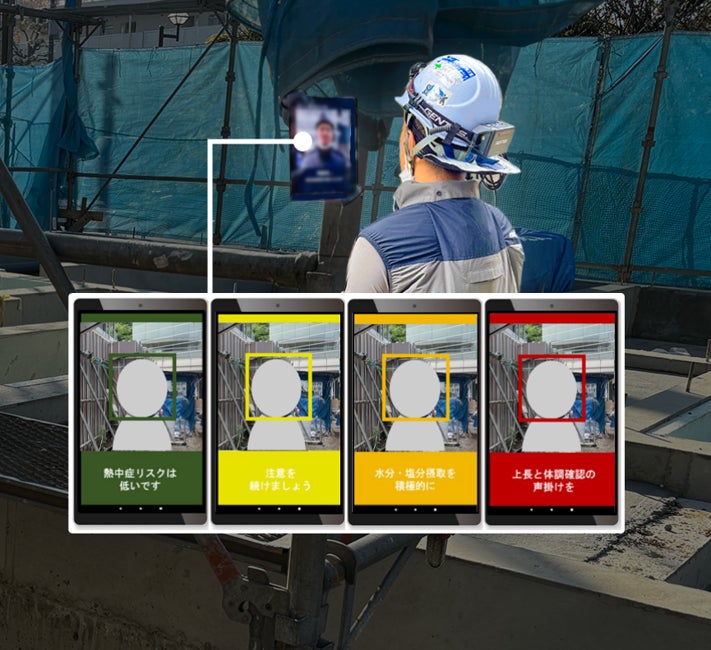 カオカラは顔解析AIにより体調状態と外環境の暑さ指数を判定し、熱中症リスクを4段階で表示する。