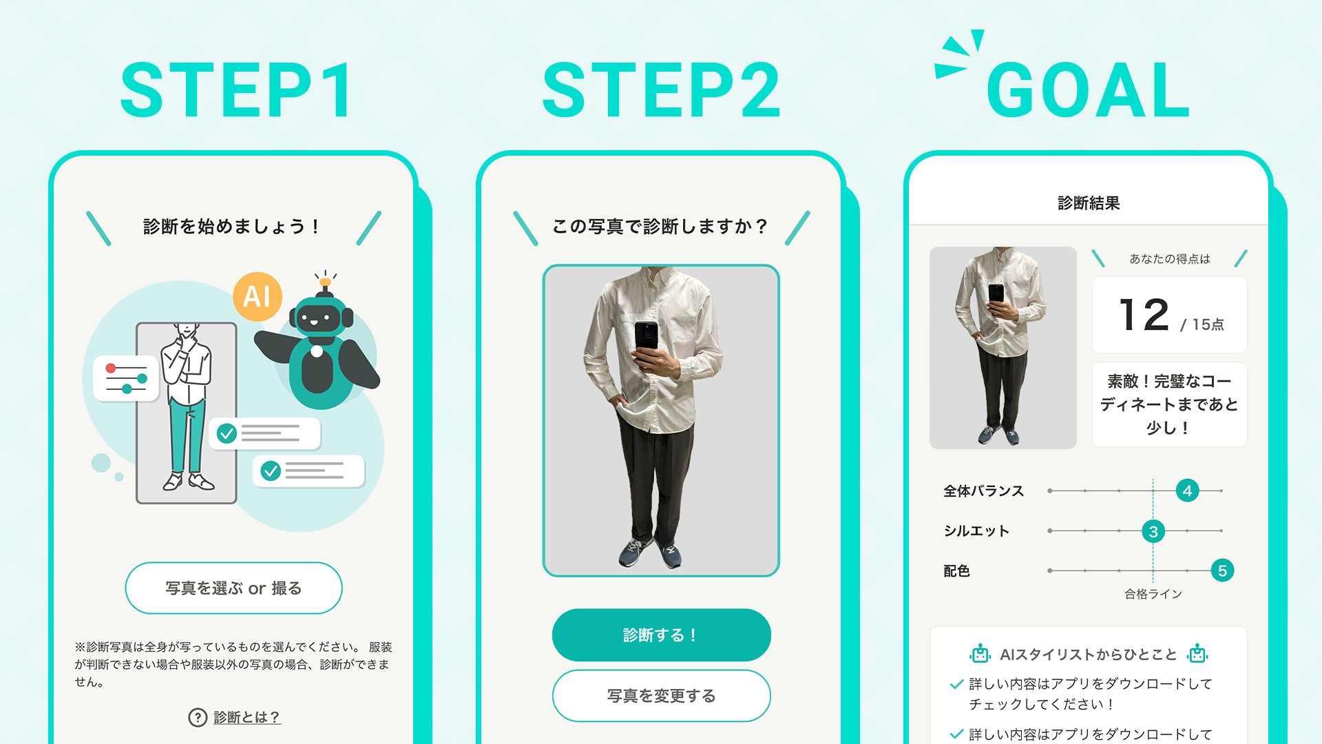 ユーザーは投稿したコーディネート写真をAIで診断し、ファッションレベルを評価できます。